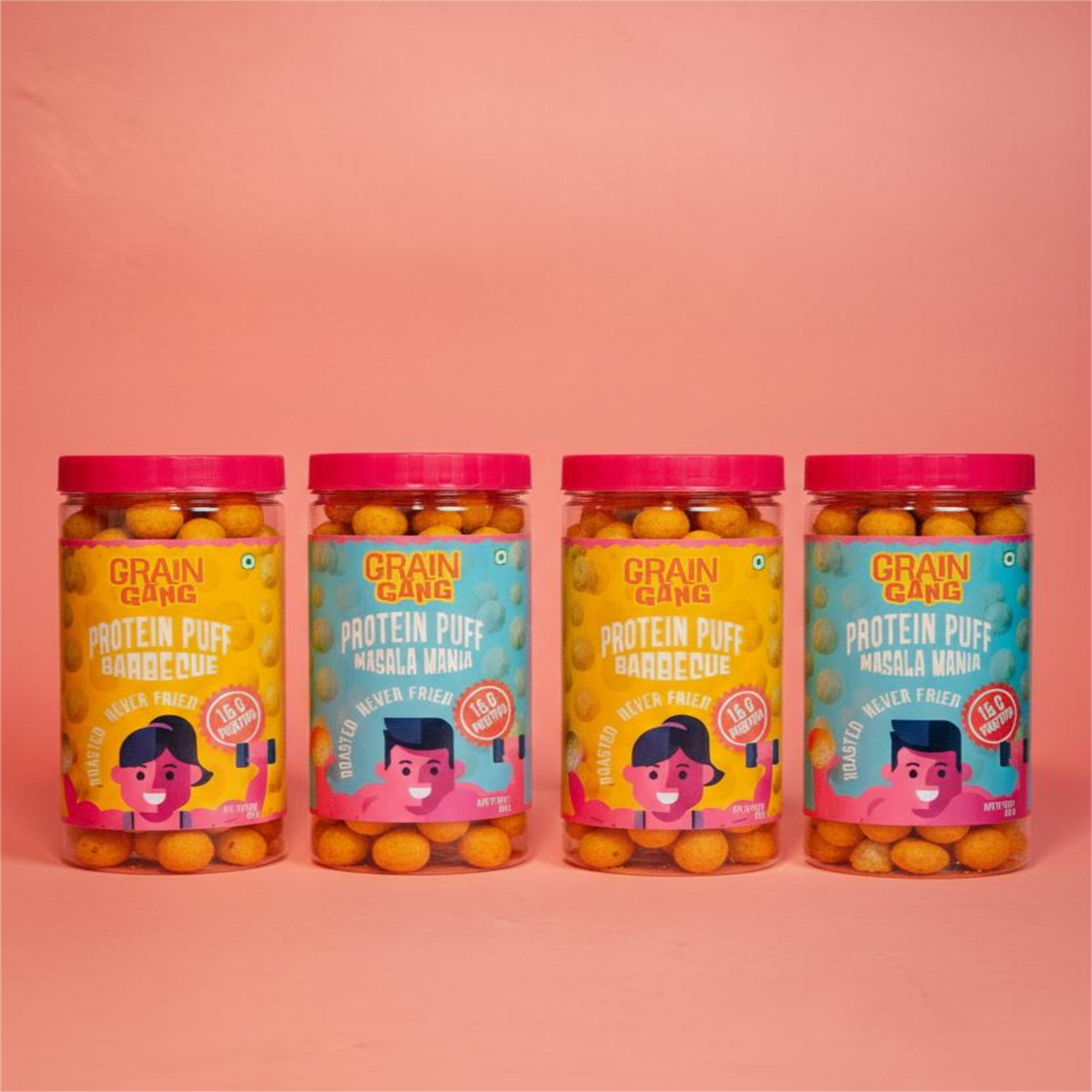 Your favourite GrainGanG puffs in one box! Enjoy 2 Masala Protein Puffs + 2 Barbecue Protein Puffs crunchy, protein-packed and guilt-free snacking for anytime cravings.